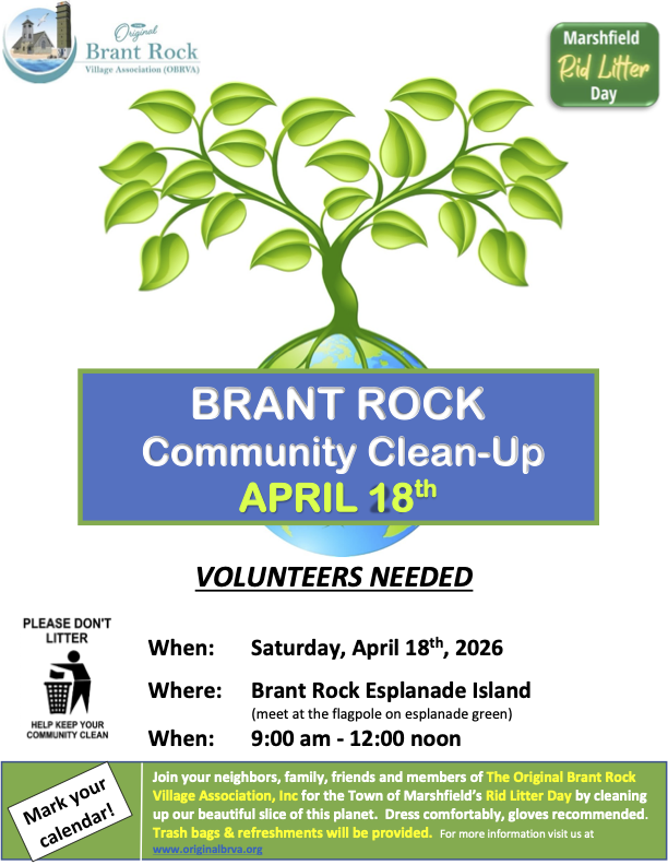 Community Clean-Up Saturday, April 18, 2026 9:00 AM 12:00 PM The Original Brant Rock Village Association PO Box 1 Brant Rock, MA, 02020 United States (map) Google Calendar ICS